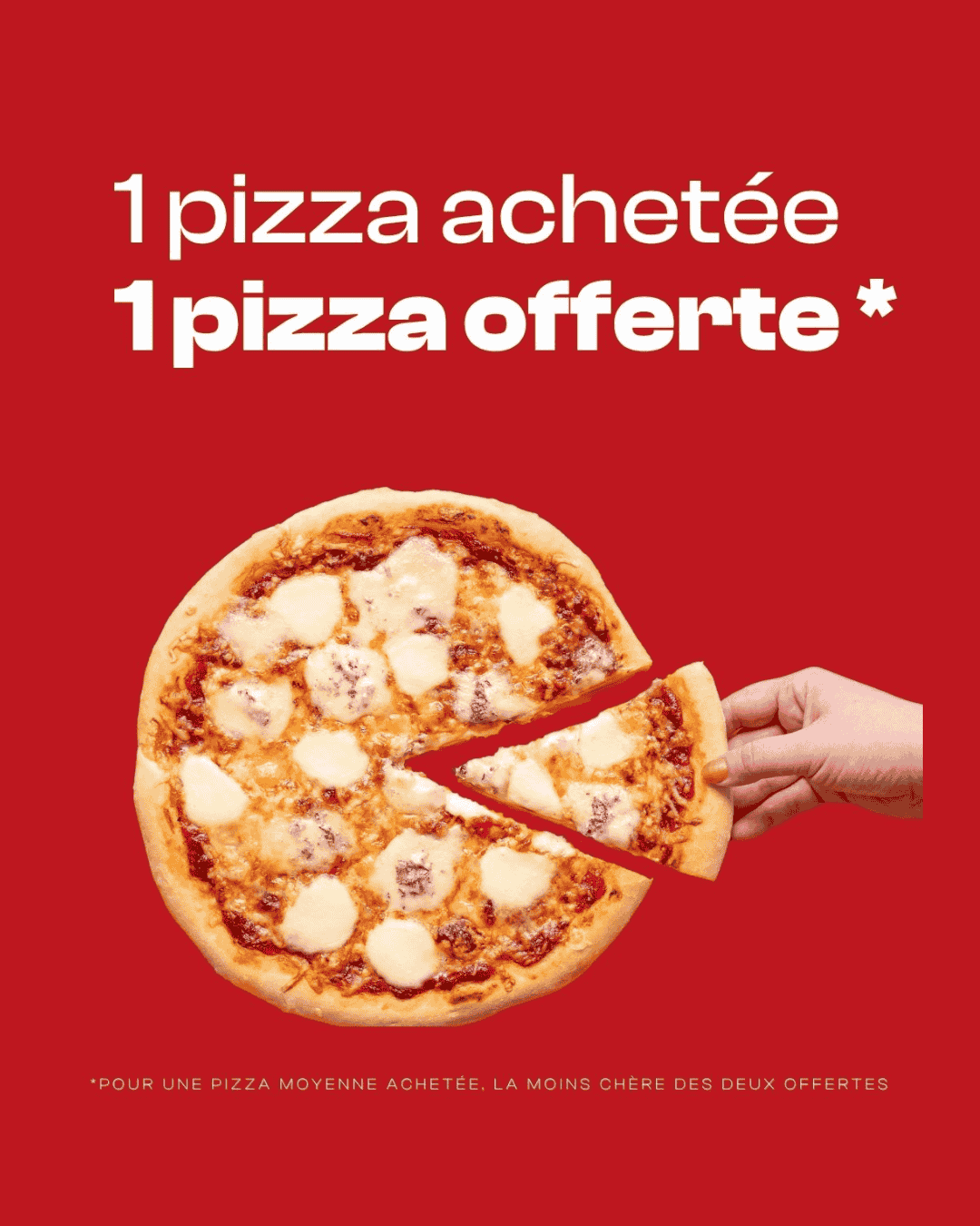 Sur nos pizzas moyennes à emporter, une pizza achetée = une pizza offerte : l’offre parfaite pour partager sans exploser le budget.